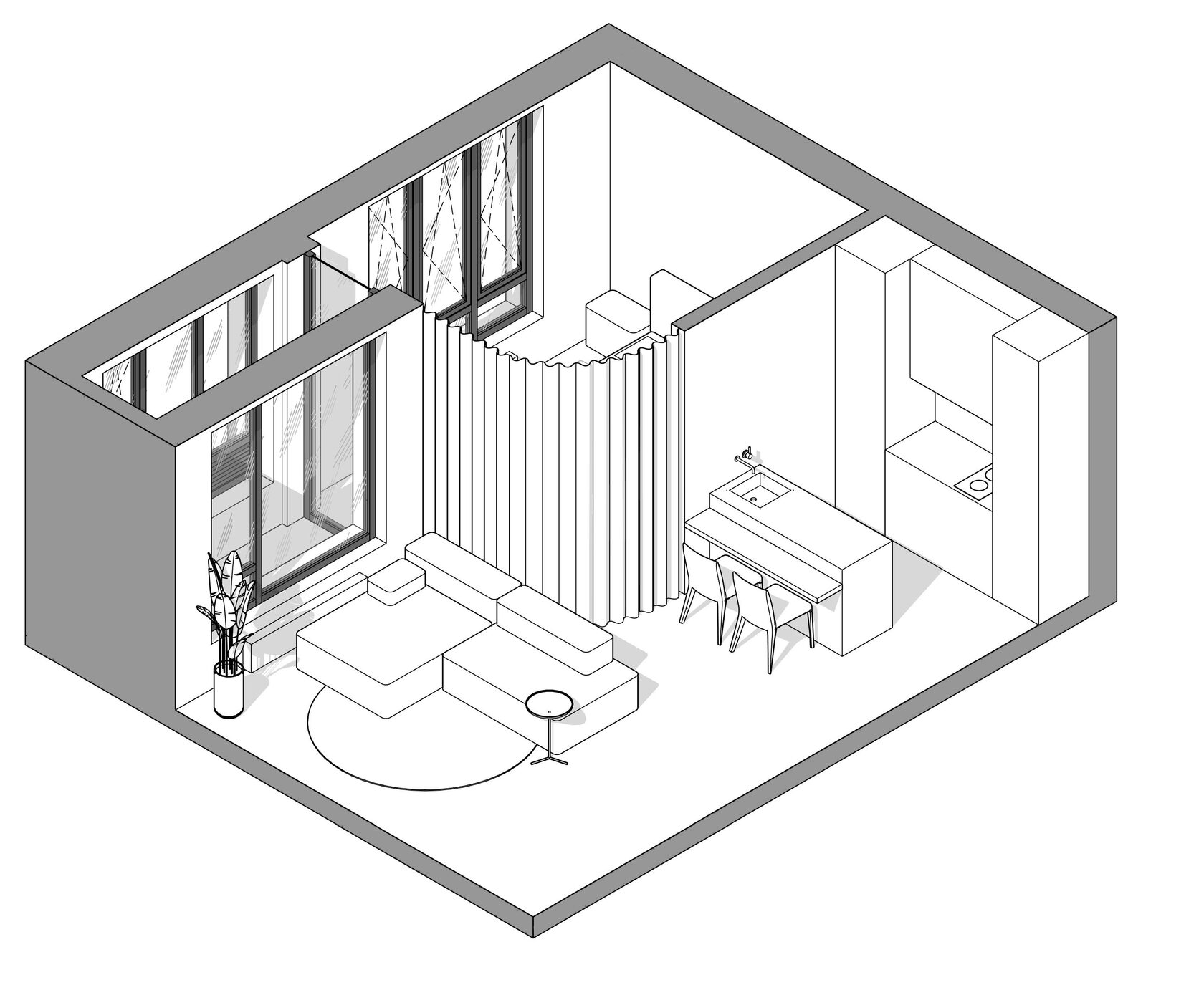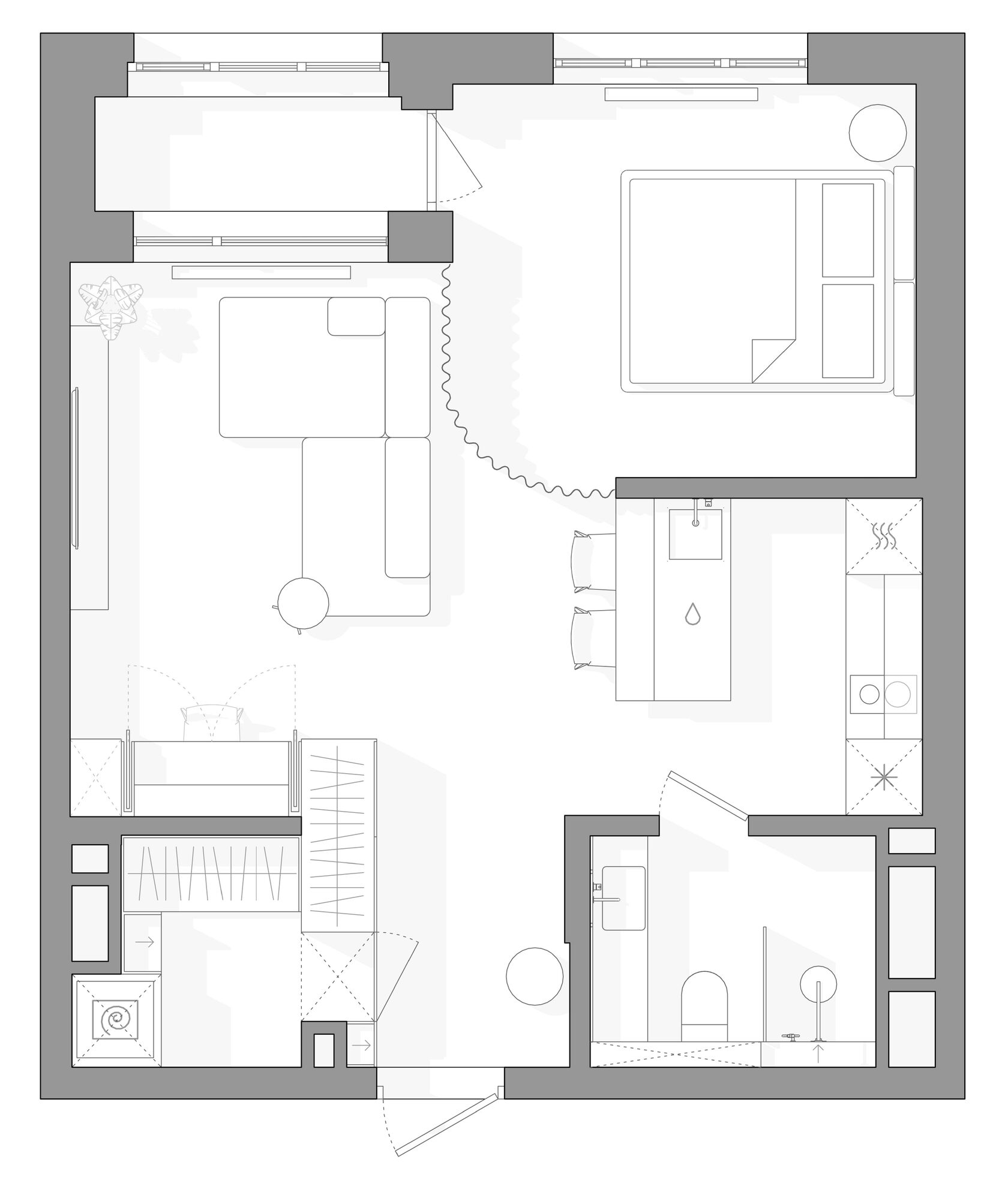 Минималистичное пространство проектировалось под сдачу в городе Казань. Нам хотелось создать место, которое позволит расслабиться после насыщенного дня.