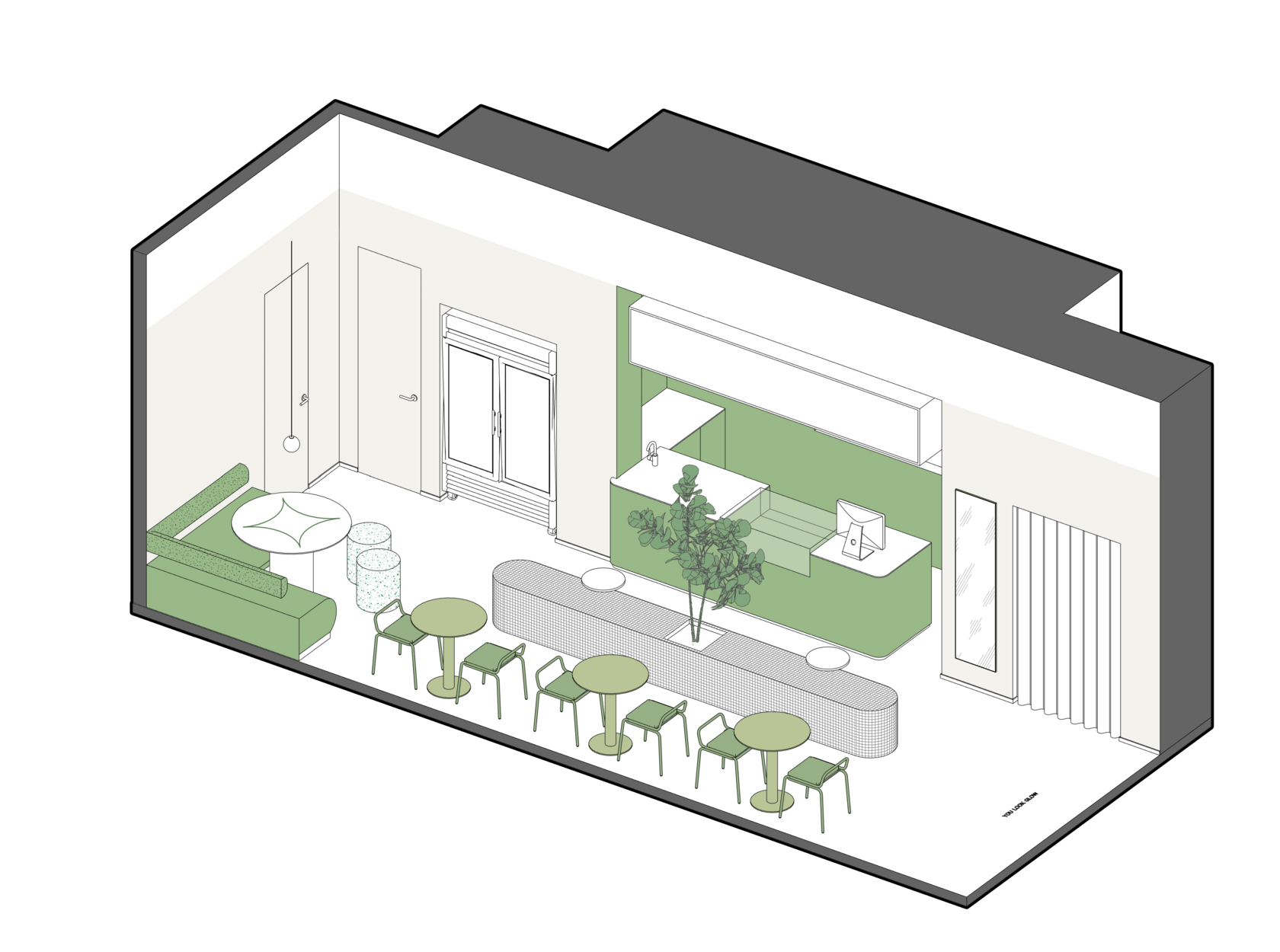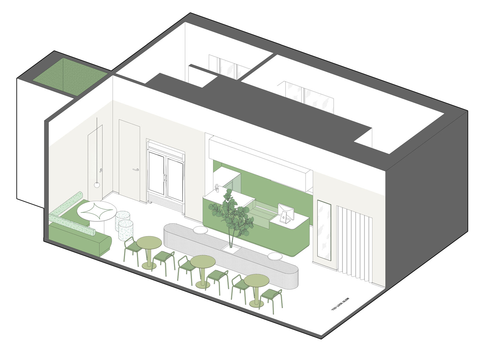 Это светлое и минималистичное пространство с акцентом в виде зеленого цвета, как продолжение концепции заведения - здоровое питание, но вкусно.